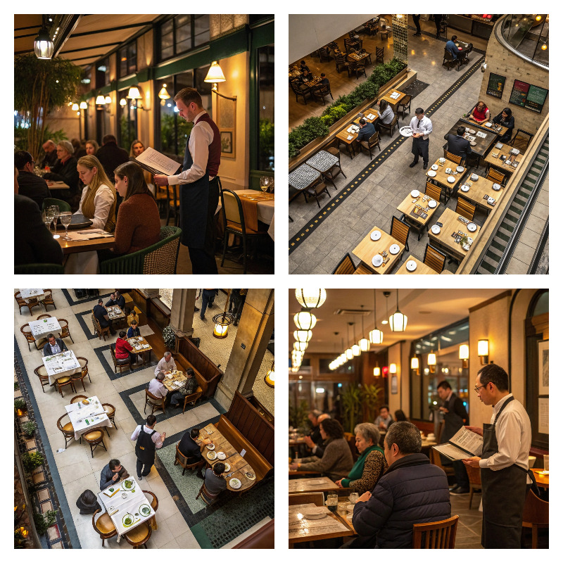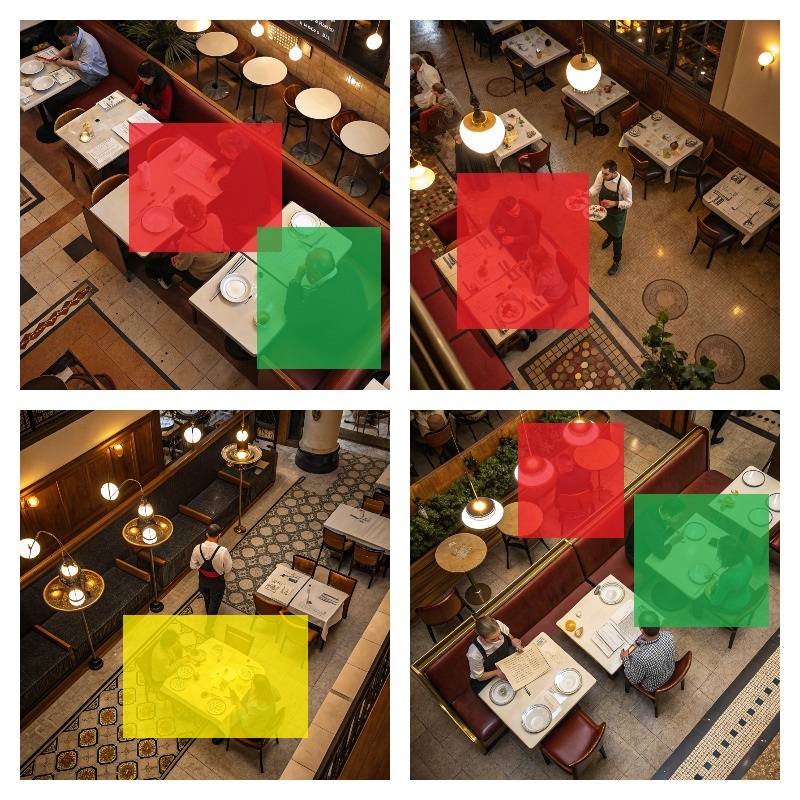 Анализ поведения посетителей за столиками и официантов в зале обслуживания. Система позволяет, например отслеживать время нахождения людей за столиками и сигнализировать о том, что время ожидания превысило определенный предел.