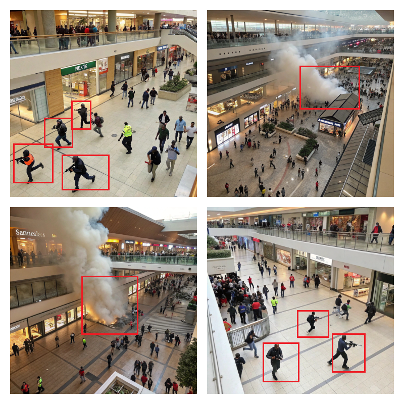 Террористические атаки в ТРЦ еще более редкие случаи, но могут приводить к катастрофическим последствиям, включая гибель людей. Моментальное обнаружение таких объектов, как оружие в руках человека позволяет незамедлительно реагировать, предупреждая людей и правоохранительные органы и обезвреживать преступников